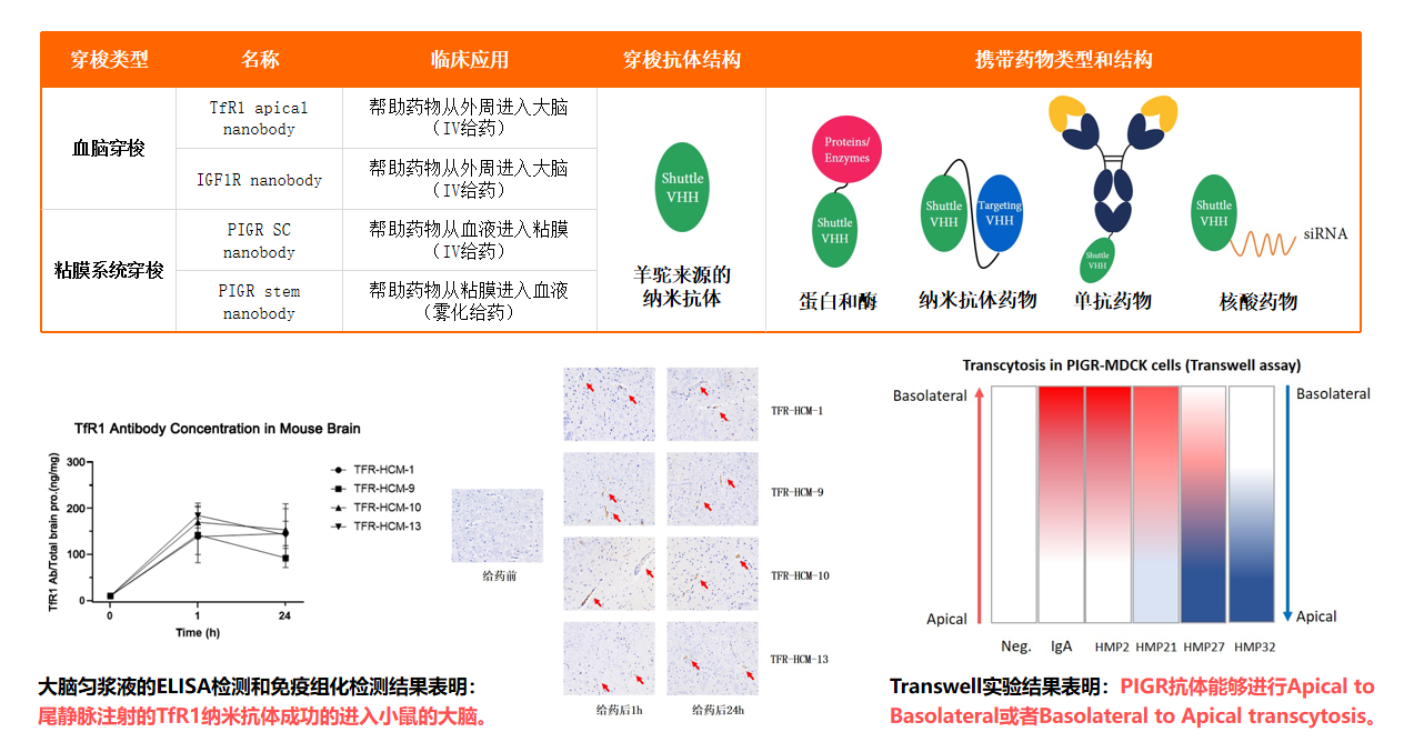 血脑屏障(blood-brain barrier, BBB)是指由脑内皮细胞(BECs)与毛细血管壁形成的用于隔离血浆与脑细胞的高度选择性半透性边界,BBB 的存在得以保护脑组织与有害物质接触,却也使得研发针对中枢神经系统疾病的治疗性抗体变得困难,能够跨越 BBB 的抗体也被称作穿梭抗体。跨越 BBB 有着多种运输途径,其中利用囊泡进行大分子运输的受体介导的跨细胞转运(RMT)是穿梭抗体最主要的运输途径。再 BEC 上高表达的 RMT 受体中,转铁蛋白受体(TfR)是最受关注的,ABLINK 同时也研究了抗 IGF1R 的穿梭抗体,基于这两种抗原,ABLINK 筛选出了合适的驼源纳米抗体。在筛选过程中需要考虑与 RMT 受体的最佳亲和力,高亲和力抗体与受体结合过强故易不能脱离而受困在血管附件,同时由于 TfR 与 IGF1R 在外周也广泛表达,故高亲和力抗体易在外周被清除,半衰期短。对于抗原表位的选择也需考虑以避免抗体与转铁蛋白的结合竞争,影响受体正常功能。筛选出的抗体需要通过对大脑匀浆液进行 ELISA 检测、免疫组化检测等方法验证抗体的穿越 BBB 功能。穿梭抗体可以与不同分子(酶、抗体、RNA 等)链接以发挥不同作用,如与抗 β 淀粉样抗体链接的穿梭抗体具有潜在的治疗阿尔兹海默症的作用。同时,ABLINK 也研究了可以进行粘膜系统穿梭的穿梭抗体。