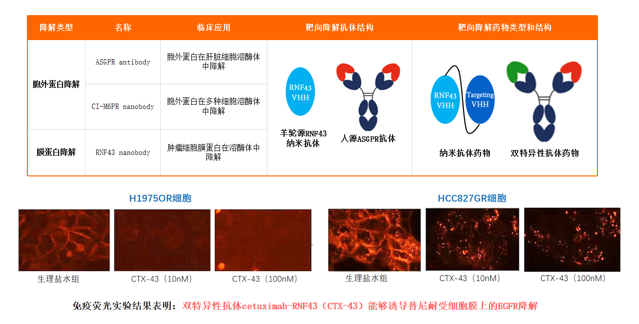 ABLINK 已经开发出了能够执行胞外蛋白和膜蛋白降解的纳米抗体药物和人源 ASGPR 抗体药物。其中以 CTX-43 为例,作为一种双特异性抗体能够靶向 RNF-43 和 EGFR 膜蛋白,EGFR 被认为与恶性肿瘤有关,免疫荧光实验表明 CTX-43 能够诱导对奥希替尼——一种 EGFR 抑制剂耐受的 H19750R 细胞和对吉非替尼耐受的 HCC827GR 细胞上的 EGFR 降解。